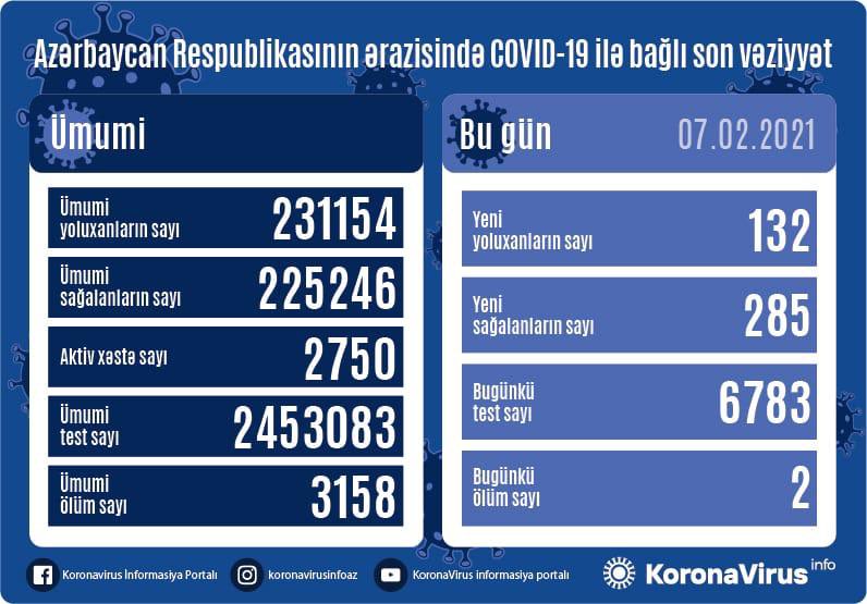 Azərbaycanda bu gün koronavirus infeksiyasına 132 yeni yoluxma faktı qeydə alınıb, 285 nəfər müalicə olunaraq sağalıb və evə buraxılıb.